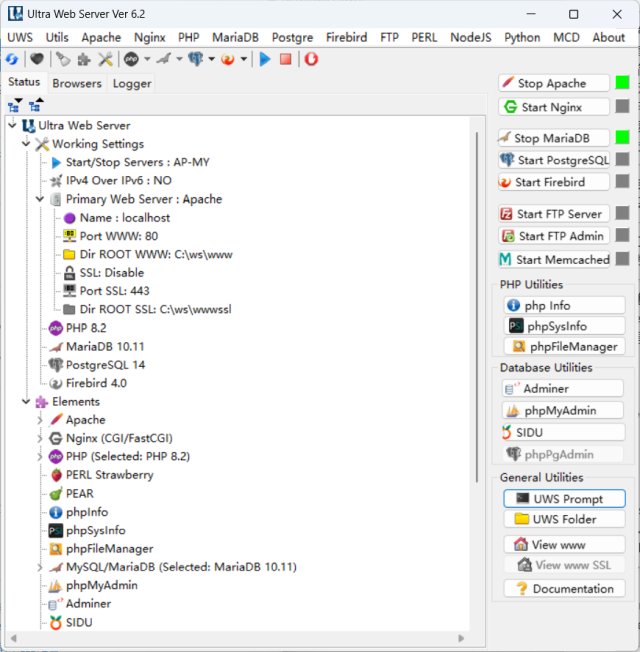 在构建和测试 Web 应用时,通常需要多个工具协同工作,例如 Web 服务器、数据库、编程语言以及管理工具。这些组件的安装和配置往往复杂且耗时。Ultra Web Server 提供了一种更简单的解决方案,将所有功能整合到一个便携式工具中。